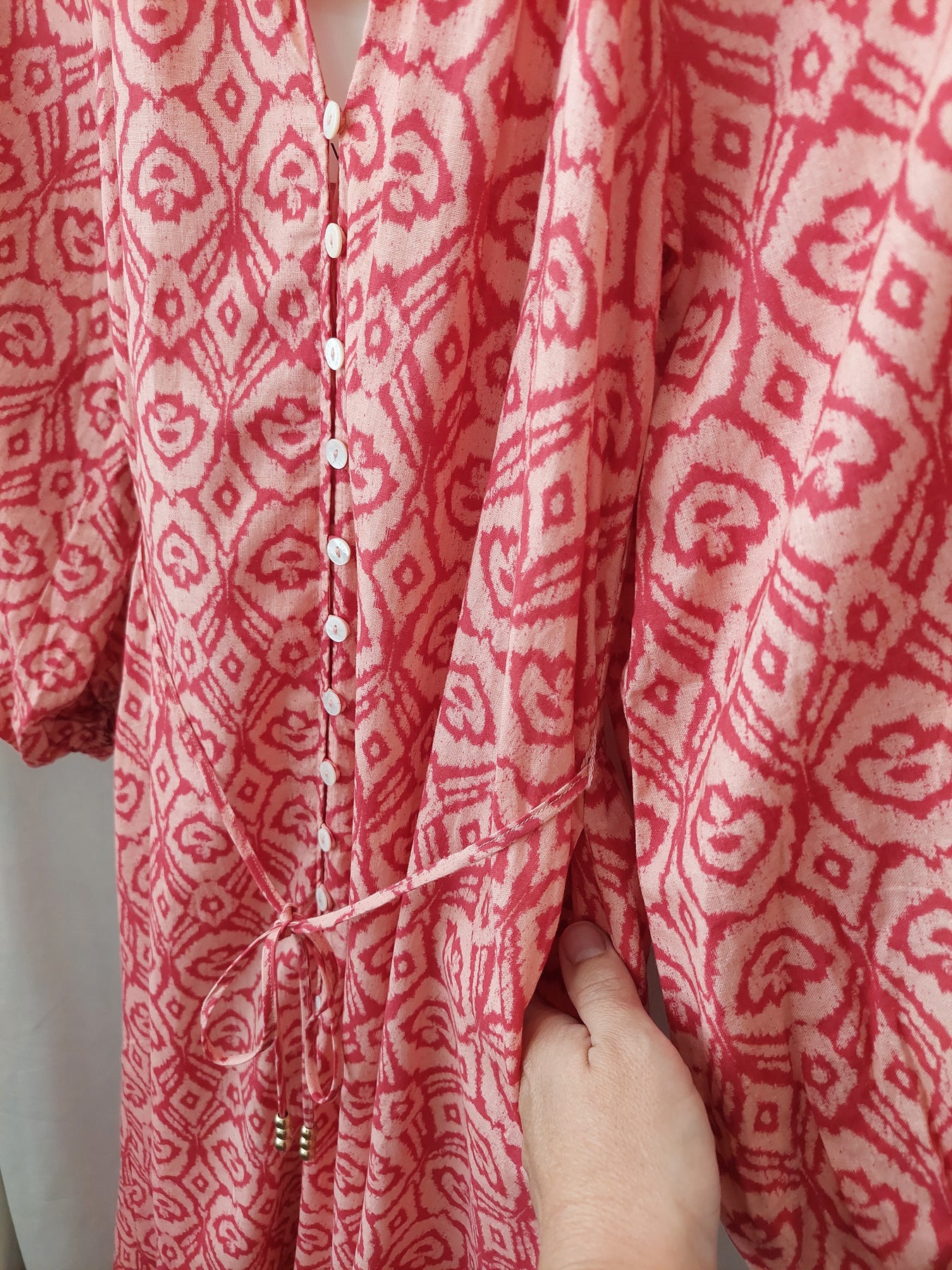 Discover Zahara, an island-inspired two-tone print in watermelon tones. Crafted from a linen-cotton blend, the Zahara Maxi Dress features a button-through front, full-length blouson sleeves, and a stand collar finished with lace edging and shirring details. Accentuate the waist with the adjustable tie.