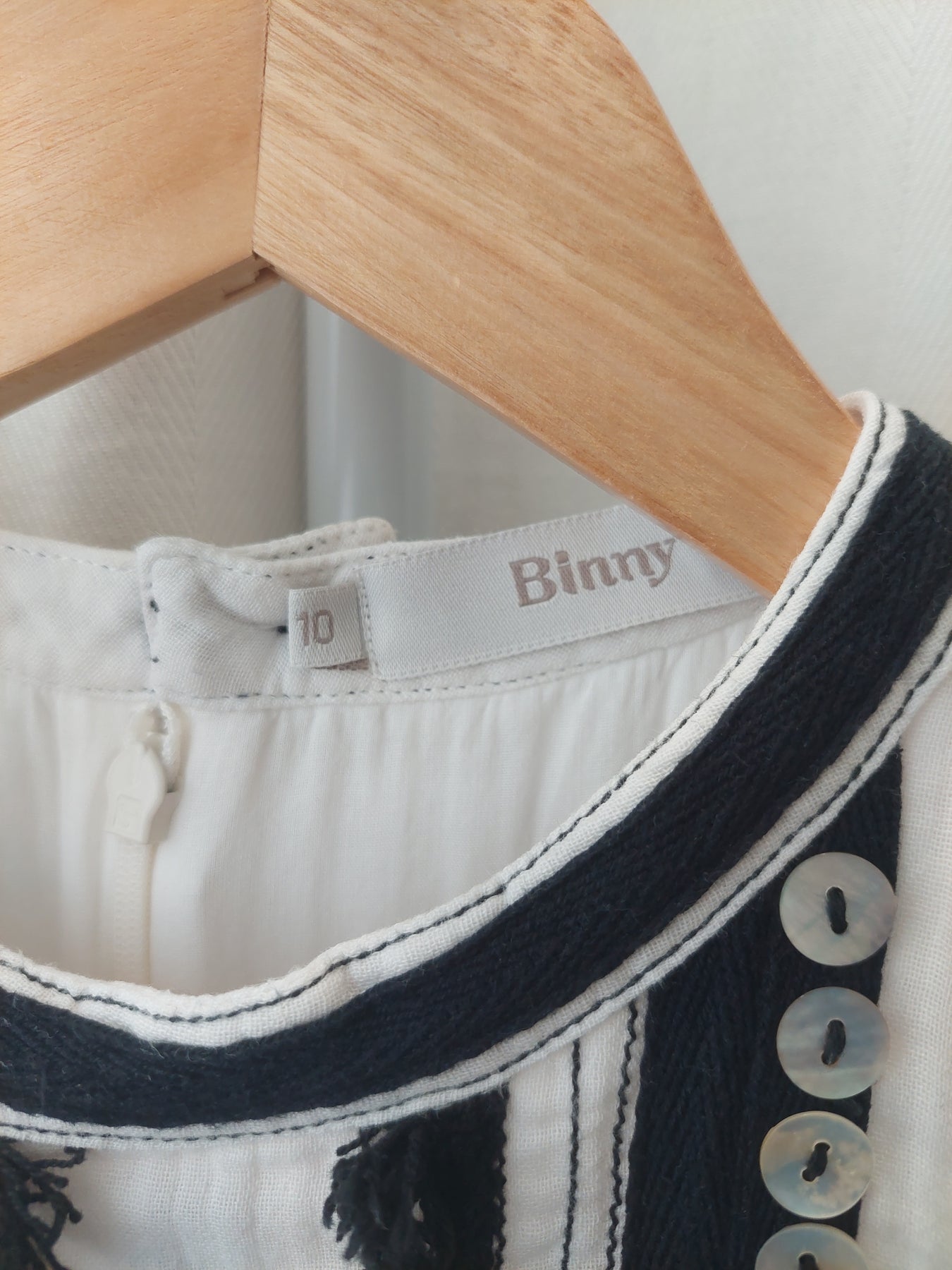 Cheesecloth Cotton with mother of pearl button embellishment and tassel trim
